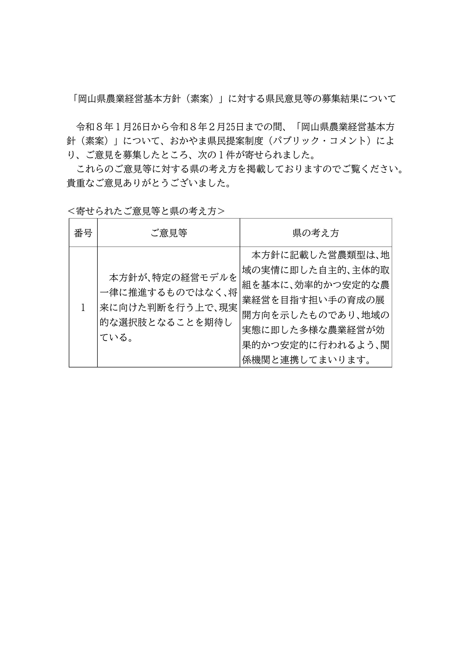 「岡山県農業経営基本方針(素案)」に対する県民意見等の募集結果について
