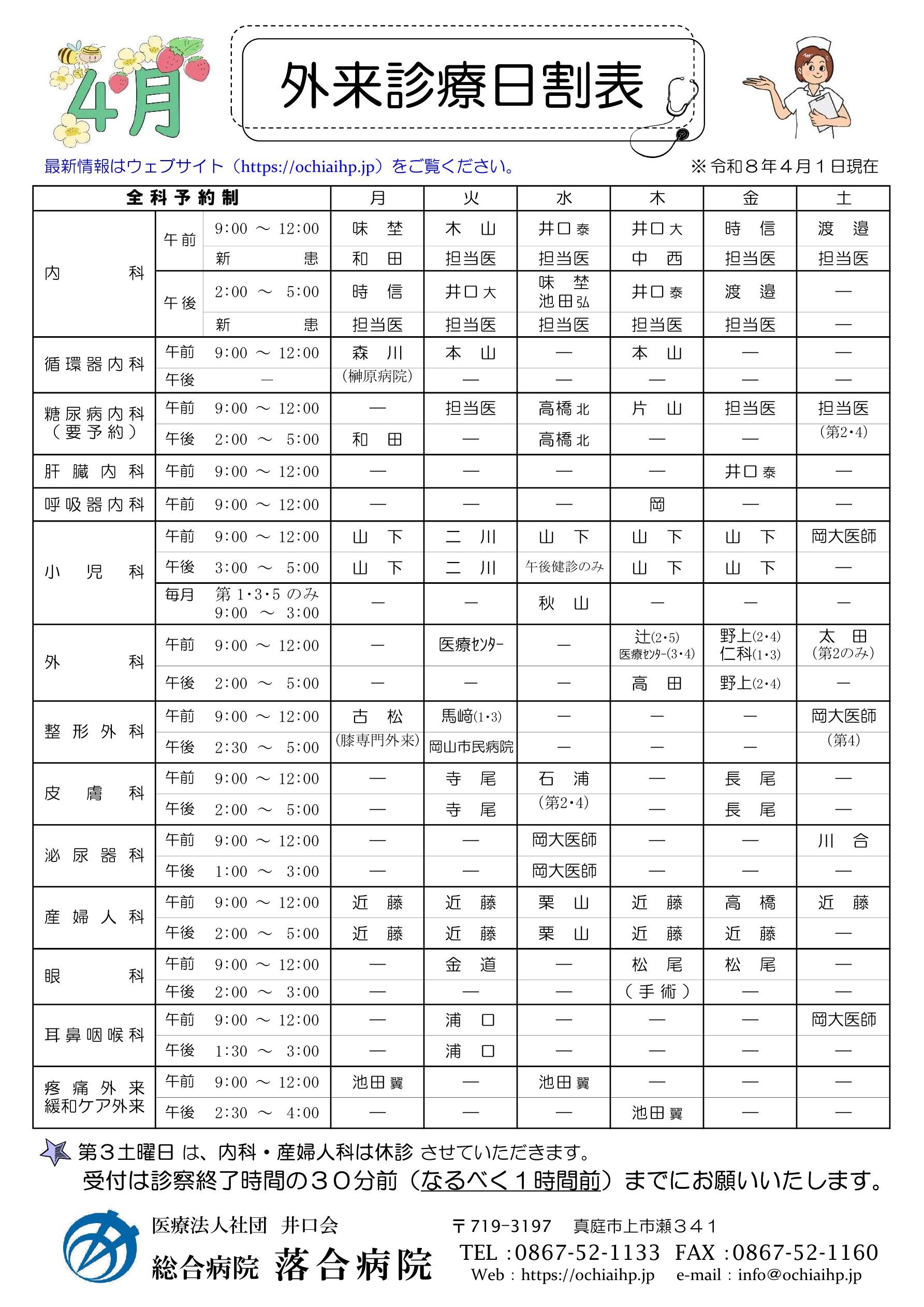 落合病院/外来診療日割表(2026年4月)