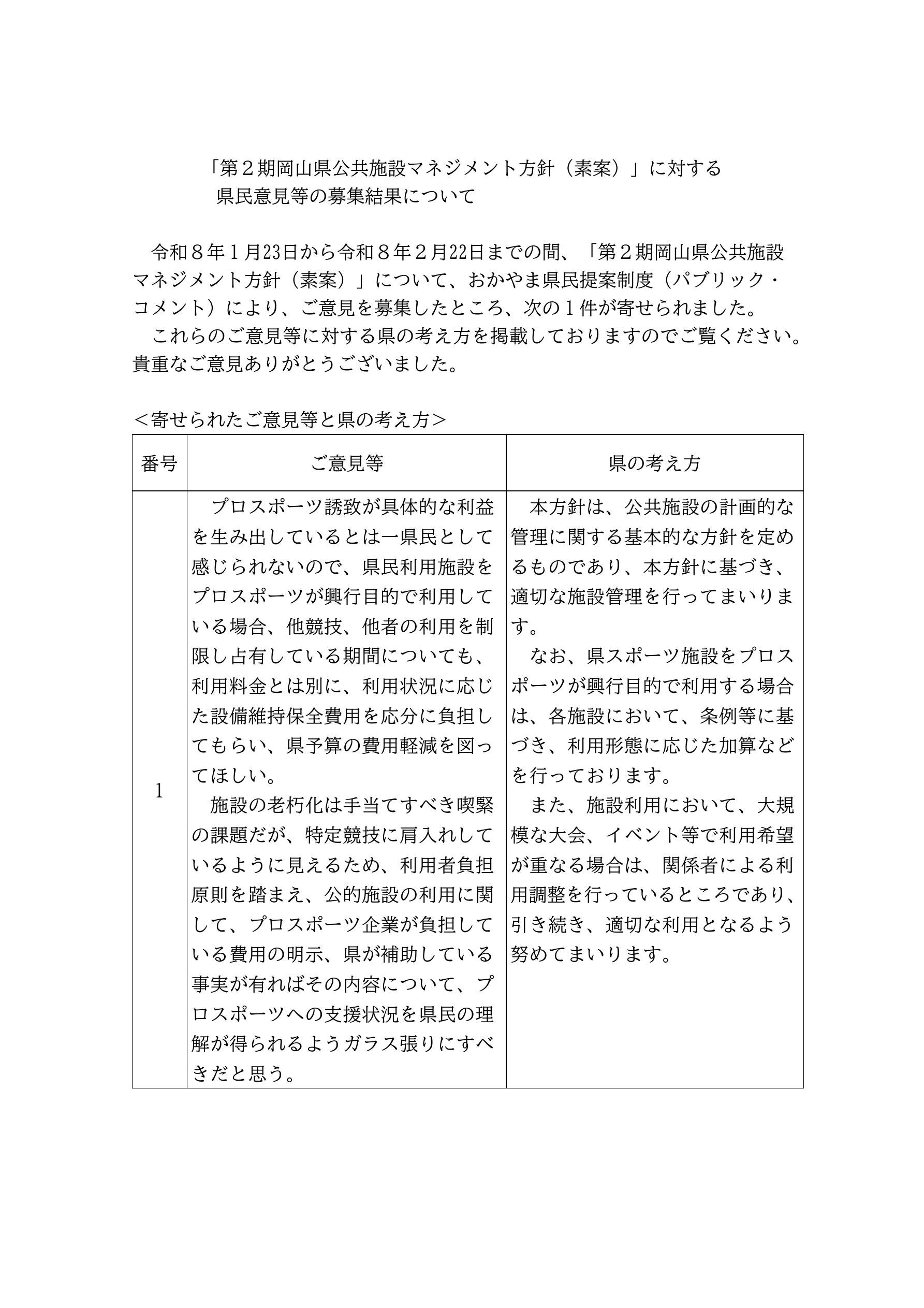 「第2期岡山県公共施設マネジメント方針(素案)」に対する県民意見等の募集結果について