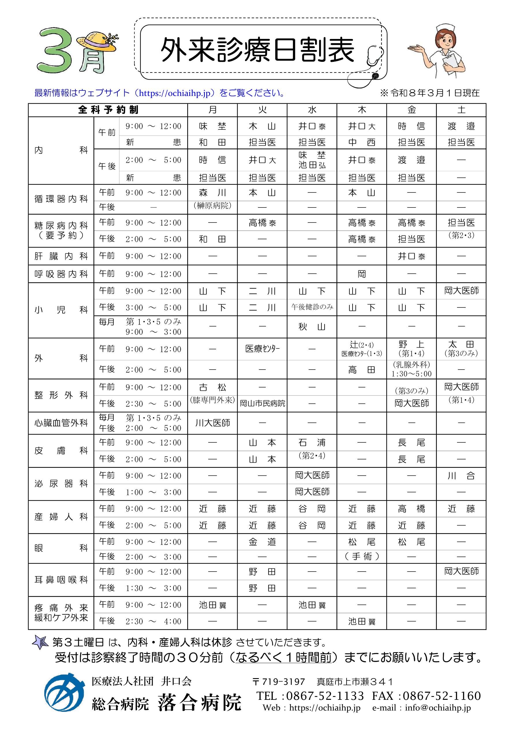 落合病院/外来診療日割表(2026年3月)