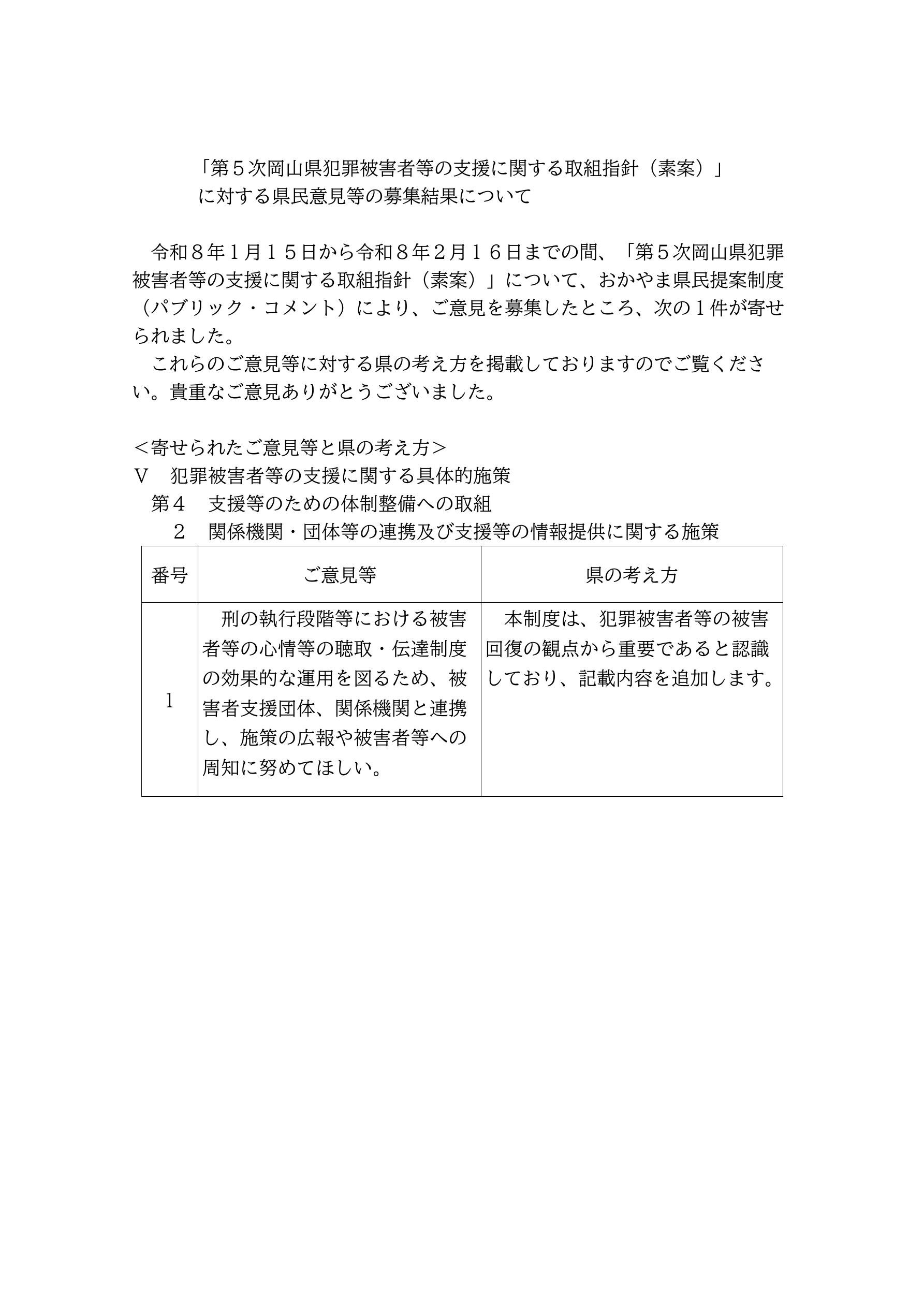 「第5次岡山県犯罪被害者等の支援に関する取組指針(素案)」に対する県民意見等の募集結果について